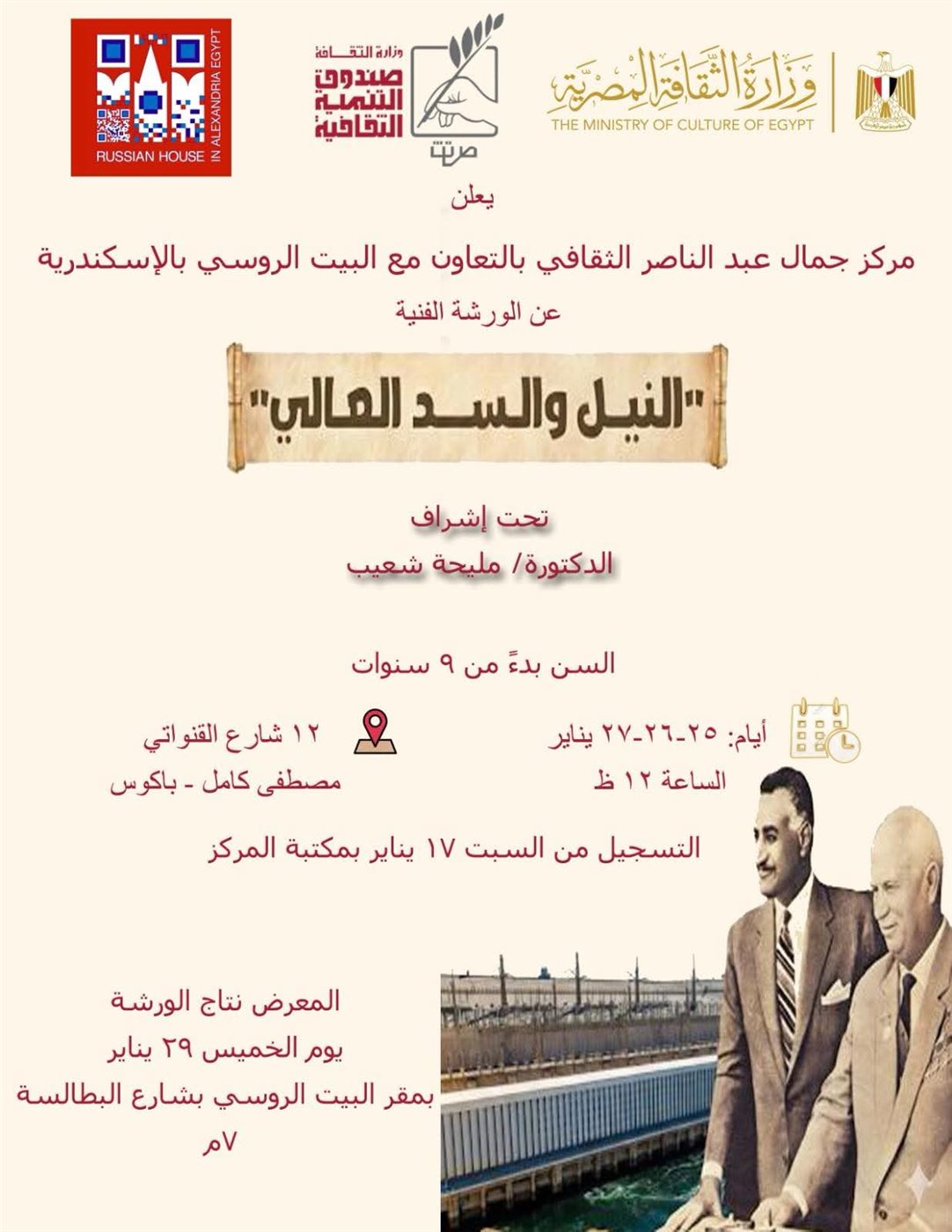 ينظم صندوق التنمية الثقافية، من خلال مركز جمال عبد الناصر الثقافي، وبالتعاون مع البيت الروسي بالإسكندرية، ورشة عمل فنية بعنوان «النيل والسد العالي»، وذلك بمناسبة مرور 55 عامًا على افتتاح السد العالي، أحد أهم المشروعات القومية في تاريخ مصر الحديث، ورمزًا للتعاون المصري الروسي.