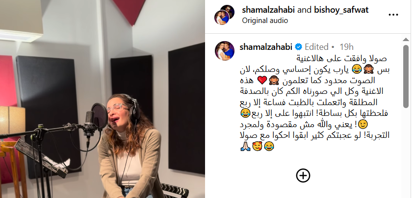 وتابعت: "يارب يكون إحساسي وصلكم، لأن الصوت محدود كما تعلمون 🙈❤️ هذه الأغنية وكل اللي صورناه الكم كان بالمصادفة المطلقة واتعملت بالضبط في ساعة إلا ربع في لحظتها بكل بساطة! انتبهوا على إلا ربع😂😉! يعني والله مش مقصودة ولمجرد التجربة! لو عجبتكم كثير إبقوا احكوا مع صولا”.