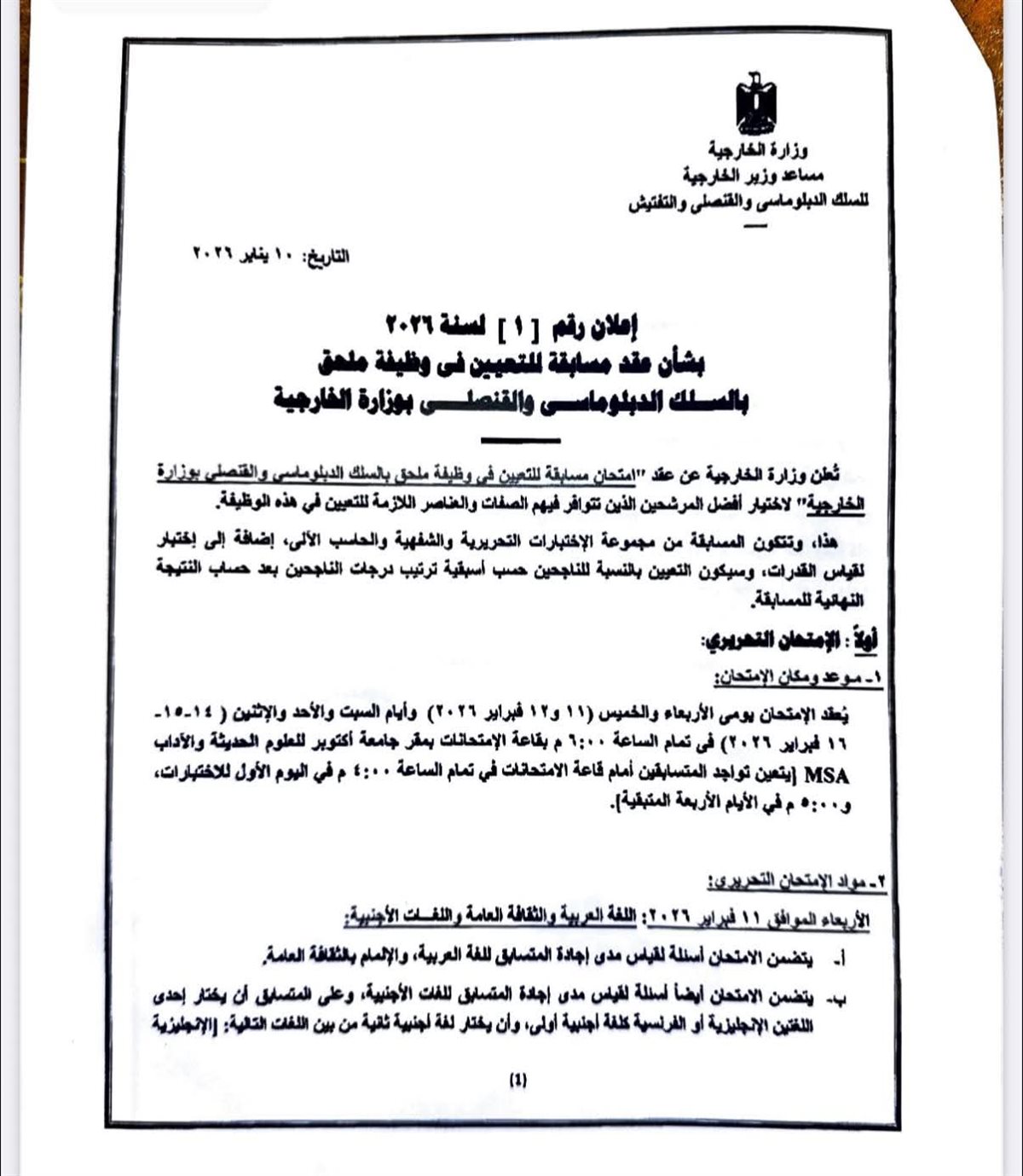 ودعت السفارة أبناء الجالية المصرية الراغبين في التقدم لشغل هذه الوظيفة إلى الاطلاع على الإعلان المرفق، والذي يتضمن الشروط والمستندات المطلوبة وآليات التقديم، تمهيدًا لاتخاذ الخطوات اللازمة وفقًا للضوابط المقررة.