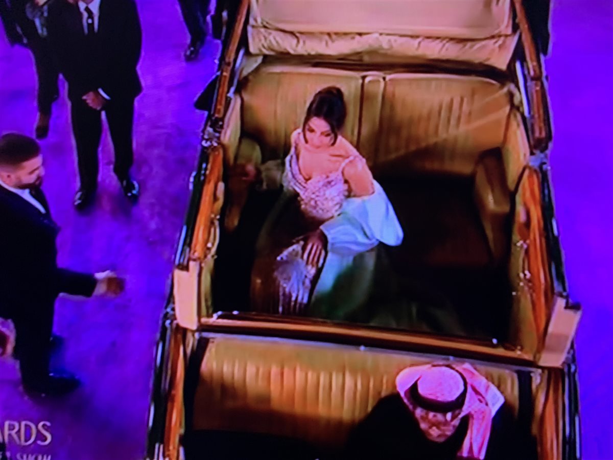 وصلت الفنانة اللبنانية نادين نسيب نجيم، بسيارة كابورليه فاخرة على السجادة الخزامية لحفل جوائز جووي اووردز 2026، والذي يقام حاليًا في الرياض بالمملكة العربية السعودية.
