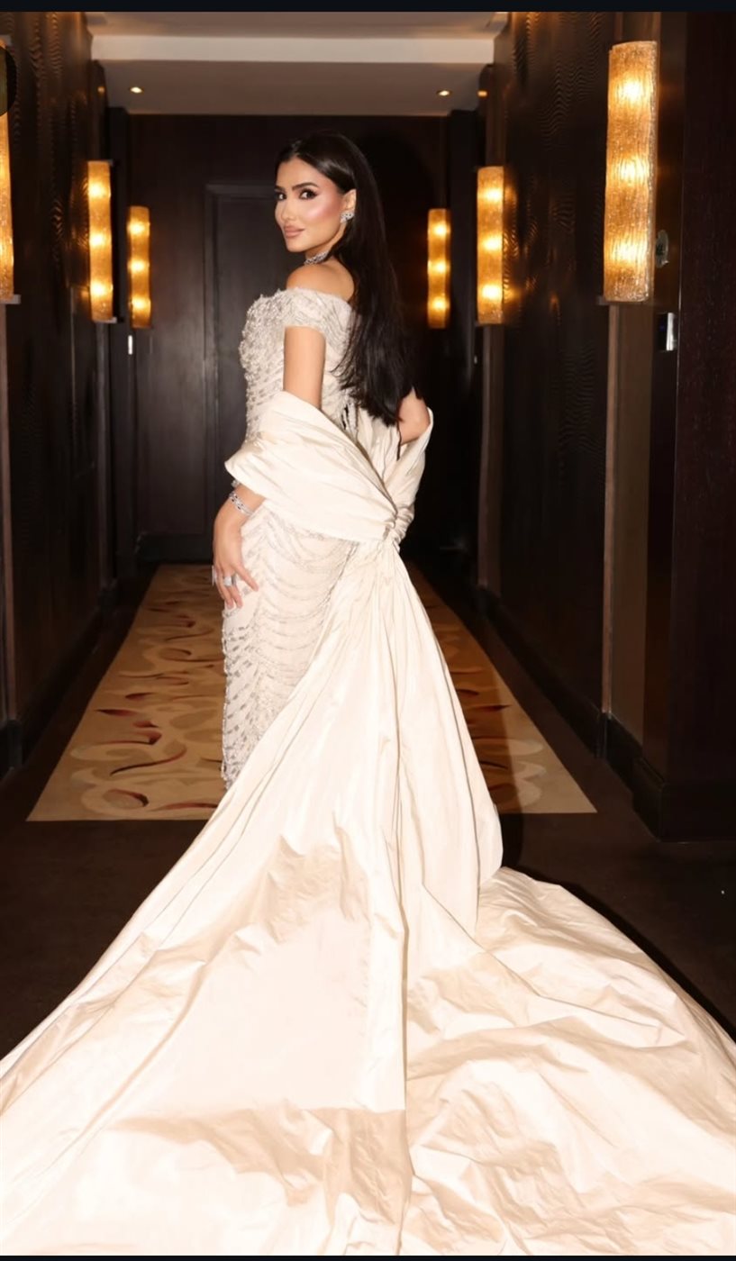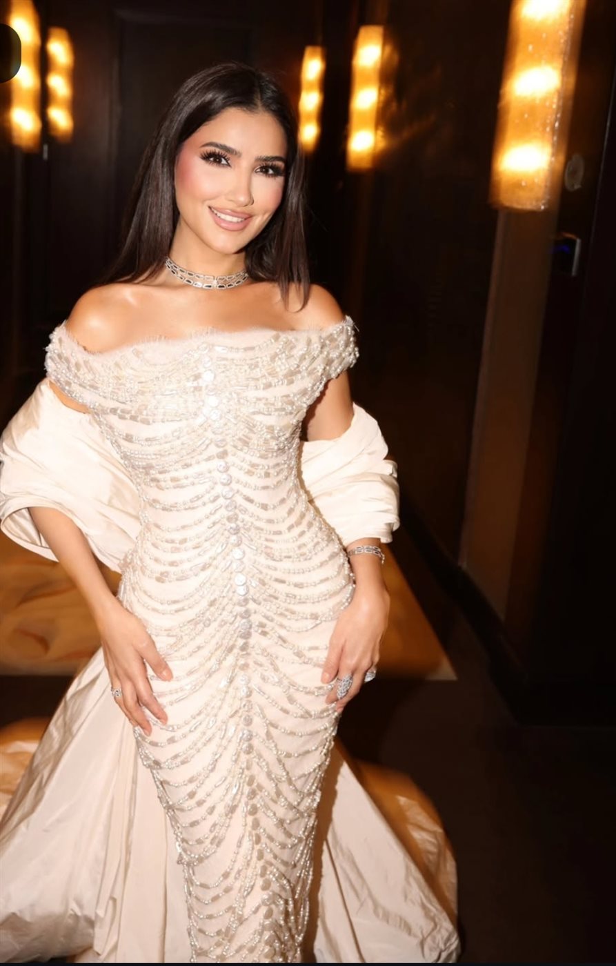 نافست مي عمر عارضات الأزياء بذوقها الراقي، مرتدية فستانًا طويلًا مجسمًا ينتمي لصيحة الـ«أوف شولدر»، صُمم من قماش ناعم مطرّز بالكامل بحبيبات الكريستال الذهبي، وعكس تصميم الفستان قوامها الرشيق ووزنها المثالي، لتتربع على عرش الموضة.