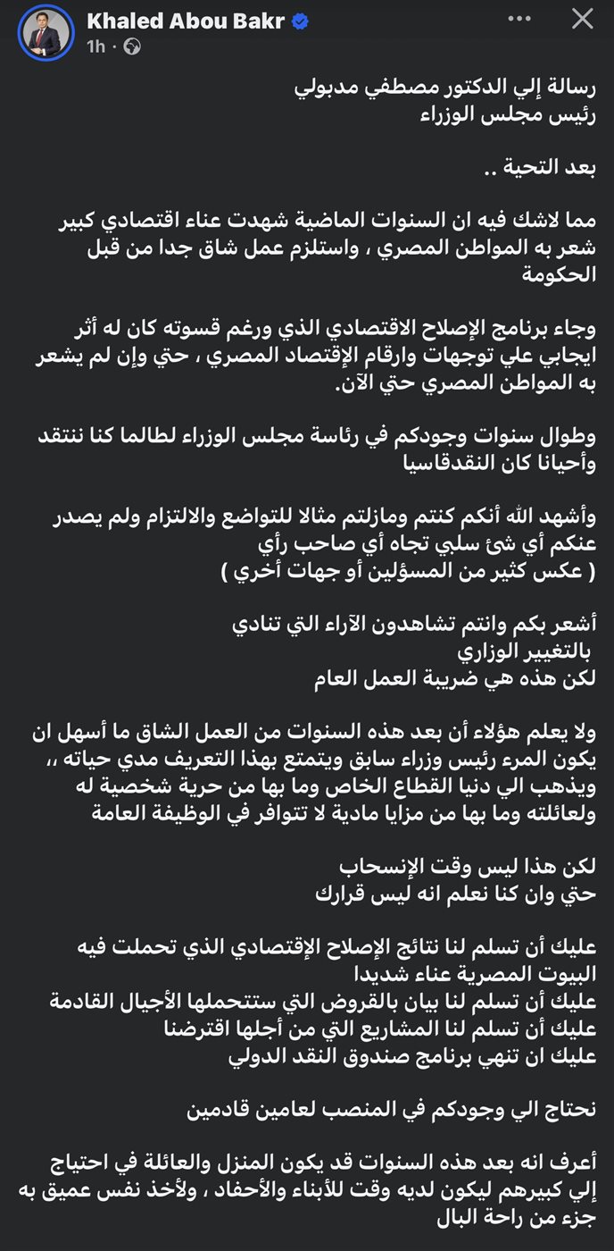 طالب خالد أبو بكر رئيس الوزراء مصطفى مدبولي بالبقاء في منصبه لعامين قادمين، مشيرًا إلى أن هذا الوقت غير مناسب للانسحاب، حيث قال: “رسالة إلى الدكتور مصطفي مدبولي رئيس مجلس الوزراء بعد التحية ..مما لاشك فيه ان السنوات الماضية شهدت عناء اقتصادي كبير شعر به المواطن المصري ، واستلزم عمل شاق جدا من قبل الحكومة”.