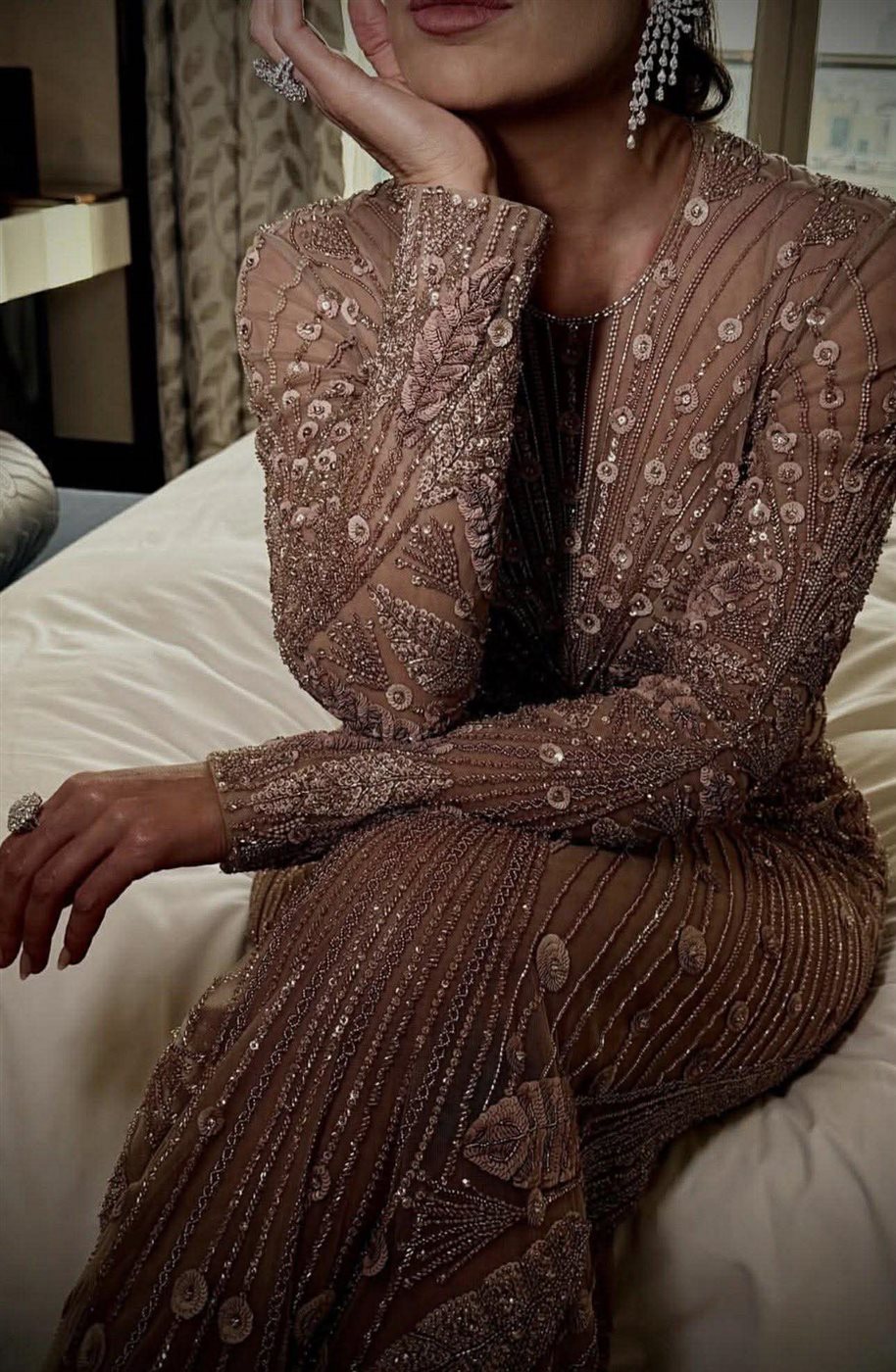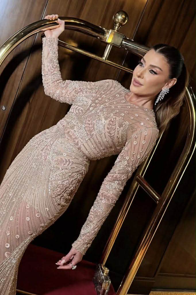 وبدت ريتا حرب بإطلالة لافتة، حيث ارتدت فستانًا طويلًا مجسمًا بأكمام طويلة، صُمّم من قماش التل المطرز باللون البيج، وعكس الفستان قوامها الرشيق ووزنها المثالي. وحمل الفستان توقيع مصمم الأزياء إيلي صعب.