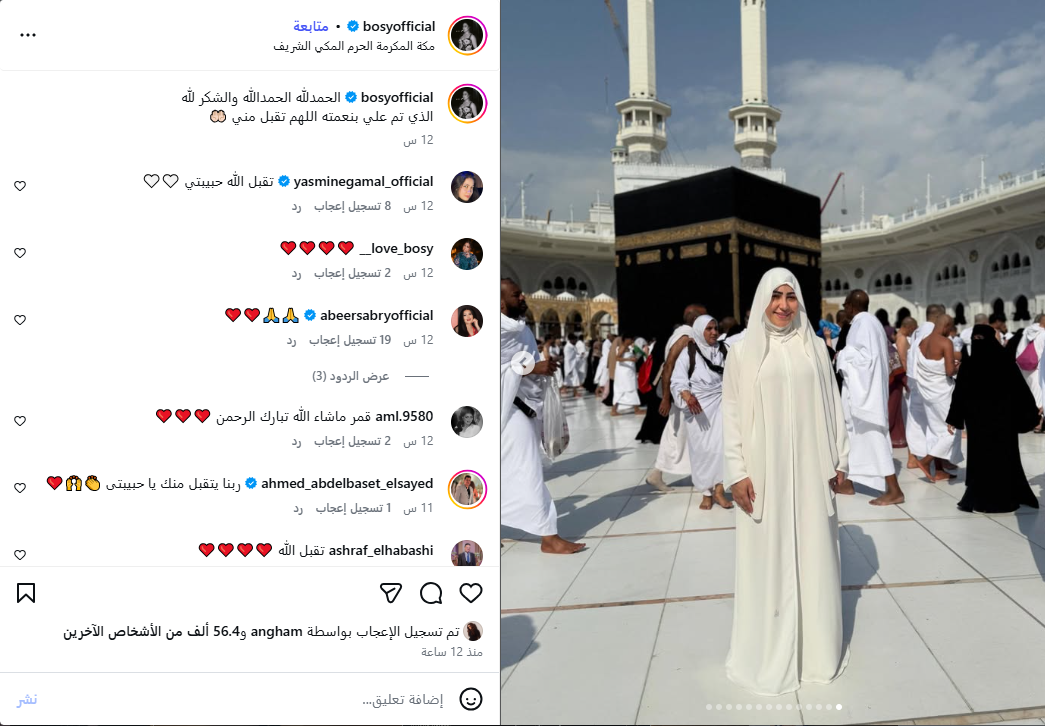 وظهرت بوسي أمام الكعبة المشرفة، ما جذب تفاعلًا واسعًا وإعجابًا كبيرًا من محبيها الذين عبّروا عن شوقهم لرؤية النجمة، وانهالت عليها التعليقات الإيجابية.