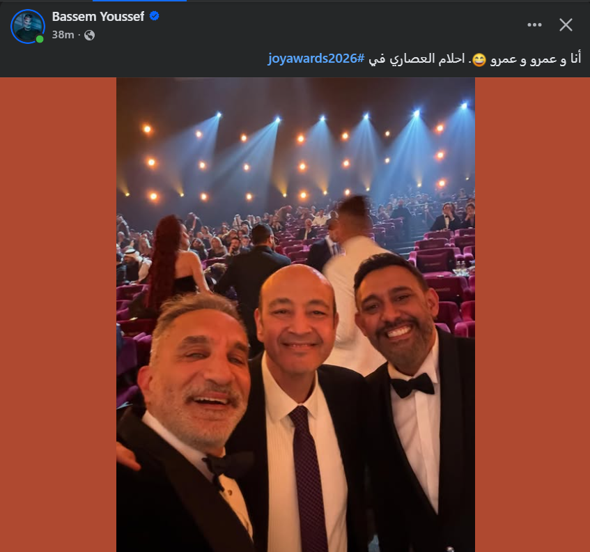 شارك باسم يوسف الصورة عبر حسابه الشخصي بموقع التواصل الإجتماعي الأشهر “فيس بوك”، وأرفقها بتعليق قائلًا: “أنا وعمرو وعمرو .. أحلام العصاري في joyawards2026”.