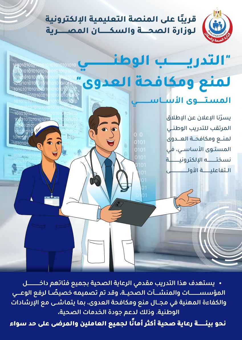 أعلنت وزارة الصحة والسكان بدء الإطلاق المرحلي للمنصة التعليمية الإلكترونية المتخصصة في التدريب الوطني على منع ومكافحة العدوى، وذلك اعتبارًا من 20 يناير 2026، موجهة إلى جميع مقدمي الرعاية الصحية بالمنشآت الصحية المختلفة.