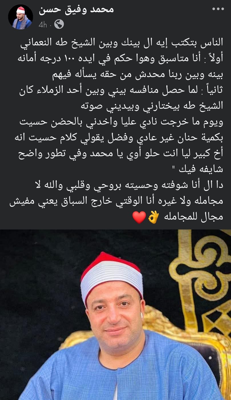 وعبر صفحته الرسمية على موقع «فيس بوك»، كتب محمد وفيق ردًا على الأسئلة المتكررة حول علاقته بالشيخ طه النعماني، قائلًا:«الناس بتكتب إيه اللي بينك وبين الشيخ طه النعماني: