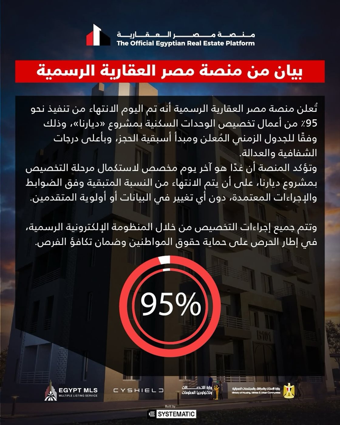 أعلنت منصة مصر العقارية أن اليوم الأحد الموافق 18 يناير، تنفيذ نحو 95%، من أعمال تخصيص الوحدات السكنية بمشروع "ديارنا" وفقًا للجدول الزمني المُعلن ومبدأ أسبقية الحجز بكل شفافية وعدالة.