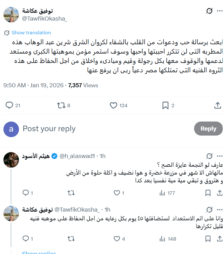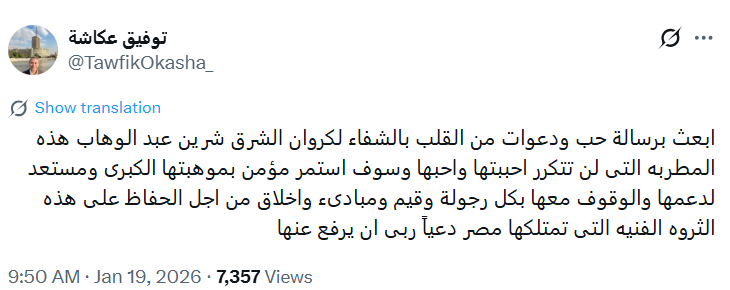 وجه الإعلامي توفيق عكاشة رسالة دعم ومساندة للمطربة شيرين عبد الوهاب في أزمتها الأخيرة، داعيًا لها بالشفاء، وذلك خلال تغريدة عبر حسابه الشخصي بمنصة التغريدات المصغرة “إكس".