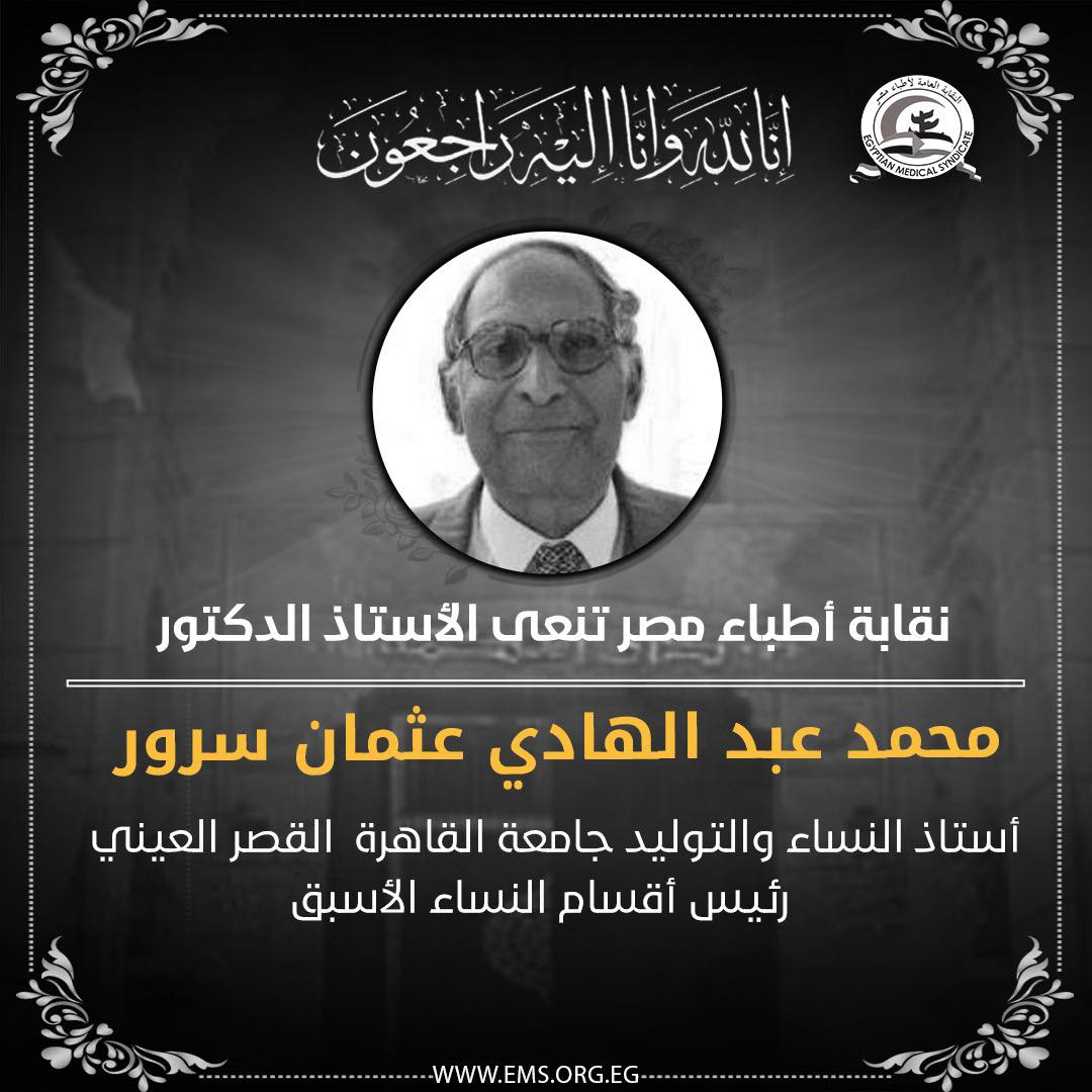 تنعى النقابة العامة للأطباء ببالغ الحزن والأسى، الدكتور محمد عبد الهادي عثمان سرور أستاذ النساء والتوليد جامعة القاهرة – القصر العيني رئيس أقسام النساء الأسبق.