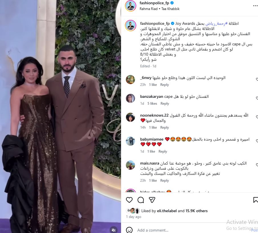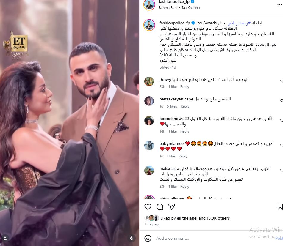 وجاء تعليق إيلي حنّا مؤيدًا لإطلالة رحمة رياض، وذلك عبر الصفحة الرسمية لشرطة الموضة على موقع إنستجرام، حيث قال:"إطلالة رحمة رياض في حفل Joy Awards، الإطلالة بشكل عام حلوة وشيك، ولم أقتلها كثيرًا".