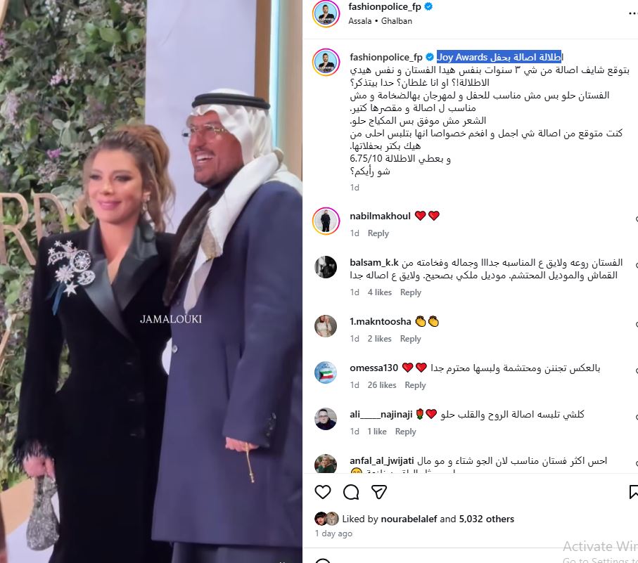 استطاعت الفنانة أصالة نصري لافت انتباه ناقد الموضة اللبناني إيلي حنا ليعبر عن رأيه بإطلالتها خلال حضورها حفل Joy Awards، الذي أقيم أمس مساء االسبت في الرياض، وذلك عبر الصفحة الرسمية لشرطة الموضة بالإنستجرام .