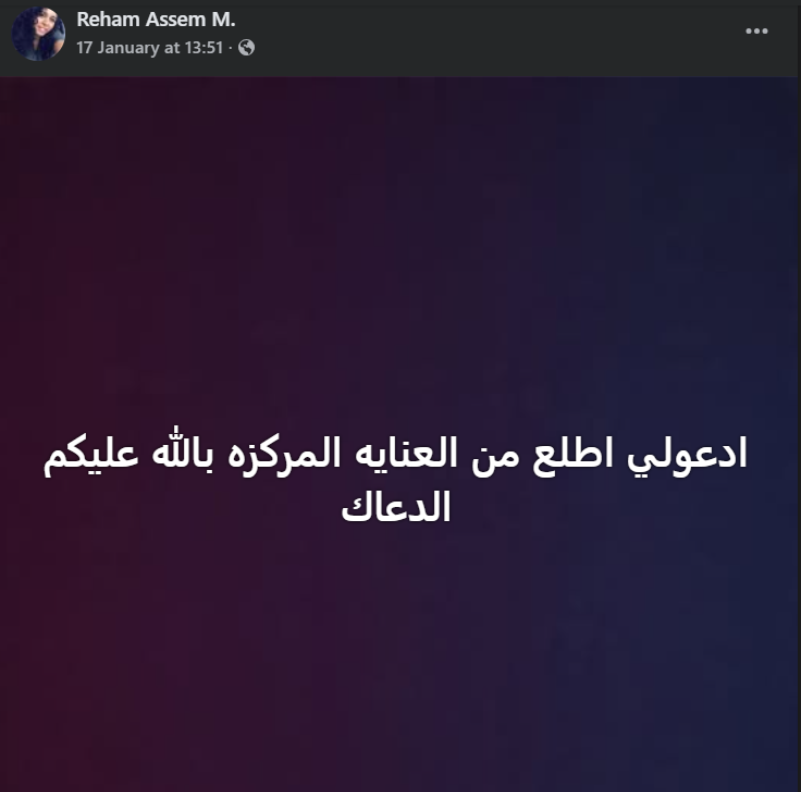 وكان آخر منشور للراحلة ريهام عاصم منذ يومين، والذي طالبت خلاله متابعيها بالدعاء لها بالشفاء العاجل والخروج من الرعاية المركزة، حيث قالت: "ادعولي اطلع من العنايه المركزه بالله عليكم الدعاء".