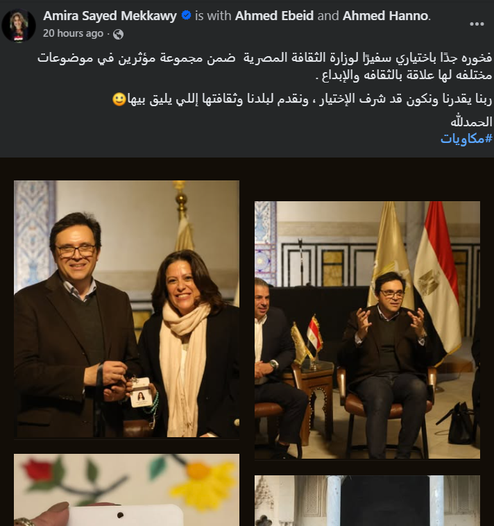 أعلنت أميرة سيد مكاوي عن تعيينها سفيرة لوزارة الثقافة، ضمن مجموعة من المؤثرين في عالم الثقافة والإبداع، وذلك خلال منشور عبر حسابها الشخصي بموقع التواصل الاجتماعي الأشهر “فيس بوك”.