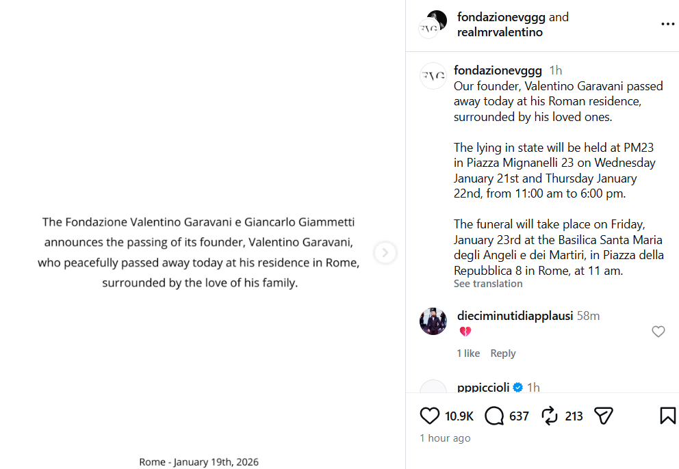 وجاء بيان إعلان وفاة فالنتينو عبر حسابه الشخصي بموقع تبادل الصور والفيديوهات "إنستجرام"، كالآتي: “توفي مؤسسنا فالنتينو غارافاني اليوم في مقر إقامته في روما، محاطا بأحبائه”.