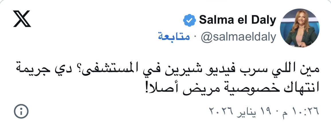 قالت سلمى الدالي: “مين اللي سرب فيديو شيرين في المستشفى؟ دي جريمة انتهاك خصوصية مريض أصلا”.