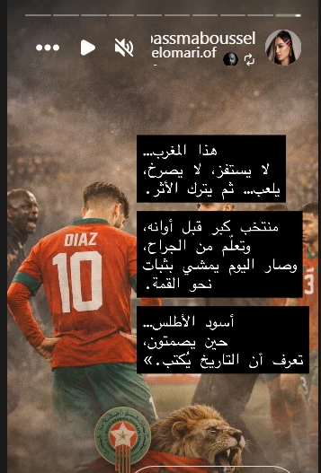 نشرت الفنانة المغربية عبر خاصية استوري على إنستجرام: "هذا المغرب لا يُستفز، لا يصرخ، يلعب ثم يترك الأثر، منتخب كبر قبل أوانه، وتعلم من الجراح، وصار اليوم يمشي بثبات نحو القمة أسود الأطلس حين يصمتون، تعرف أن التاريخ يكتب".