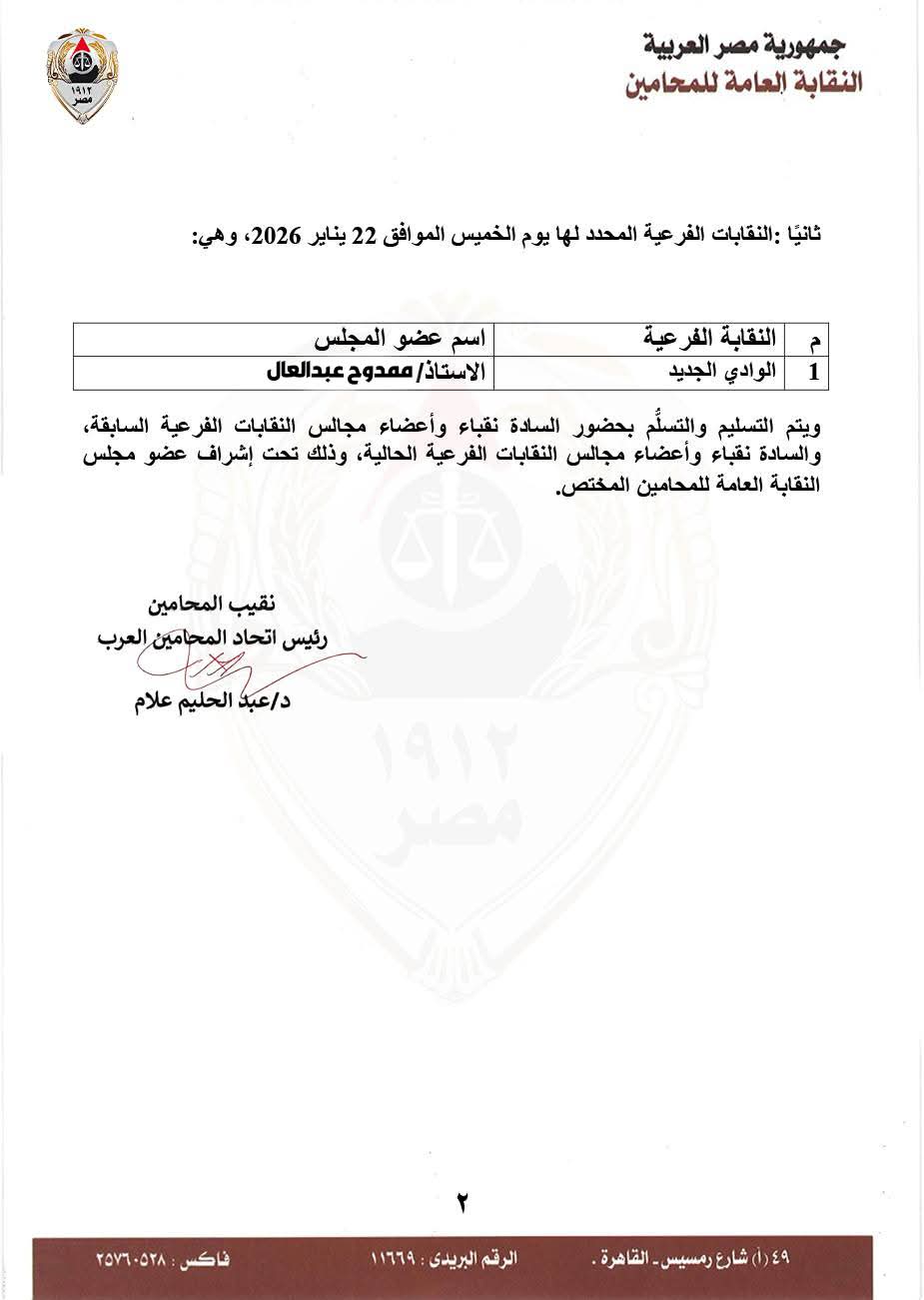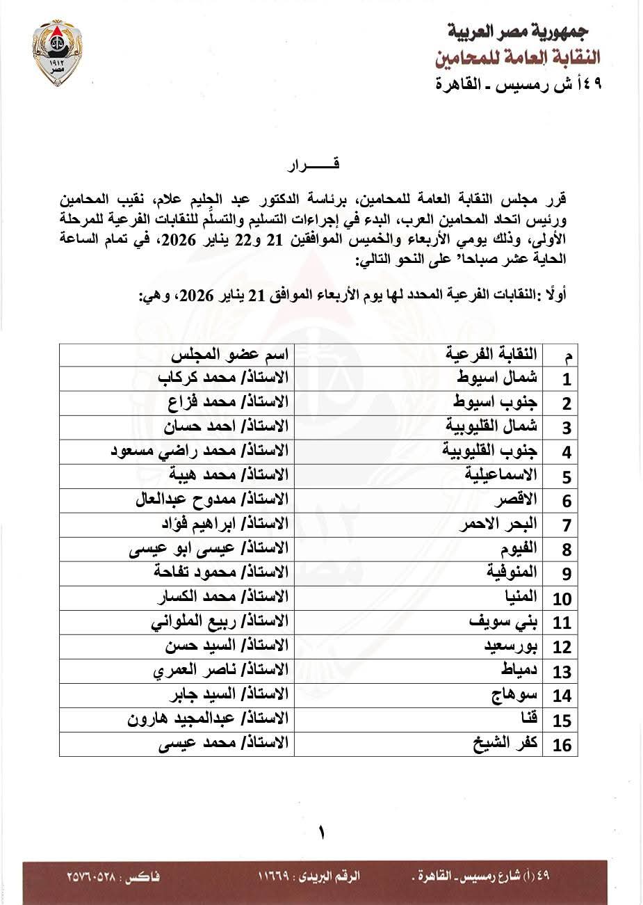 أصدر الدكتور عبدالحليم علام، نقيب المحامين ورئيس اتحاد المحامين العرب، قرارًا بأن تتم إجراءات التسليم والتسلّم للنقابات الفرعية يومي الأربعاء والخميس الموافقين 21 و22 يناير، وذلك في تمام الساعة الحادية عشرة صباحًا.