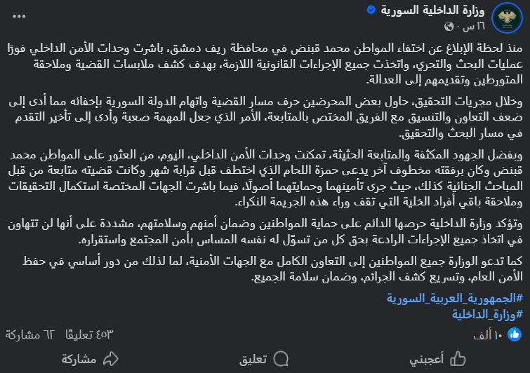 وكشفت التفاصيل قائلة:" منذ لحظة الإبلاغ عن اختفاء المواطن محمد قبنض في محافظة ريف دمشق، باشرت وحدات الأمن الداخلي فورًا عمليات البحث والتحري، واتخذت جميع الإجراءات القانونية اللازمة، بهدف كشف ملابسات القضية وملاحقة المتورطين وتقديمهم إلى العدالة، وخلال مجريات التحقيق، حاول بعض المحرضين حرف مسار القضية واتهام الدولة السورية بإخفائه مما أدى إلى ضعف التعاون والتنسيق مع الفريق المختص بالمتابعة، الأمر الذي جعل المهمة صعبة وأدى إلى تأخير التقدم في مسار البحث والتحقيق".