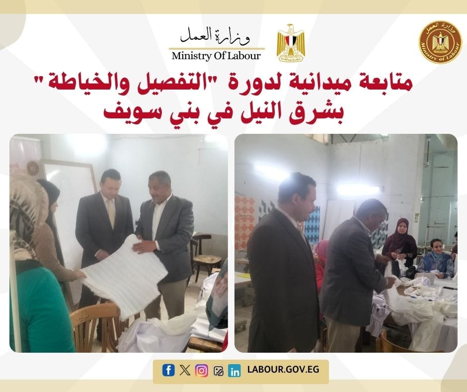 تفقد عبد الونيس عبد الله مدير مديرية العمل بالإسكندرية، تدريب الشباب بشركة "النصر للملابس والمنسوجات - كابو"، مؤكداً أن "التدريب من أجل التشغيل" هو الركيزة الأساسية لاستراتيجية الوزارة لتأهيل الشباب وفق أحدث متطلبات الصناعة.