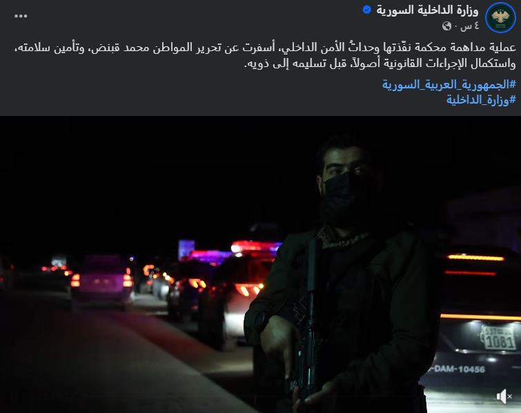 نشر الحساب الرسمي لوزارة الداخلية السورية على موقع فيسبوك مقطع فيديو يوثق عملية المداهمة التي نفذتها القوات الأمنية، والتي أسفرت عن إنقاذ المخرج السوري محمد قنبض وتسليمه إلى ذويه.
