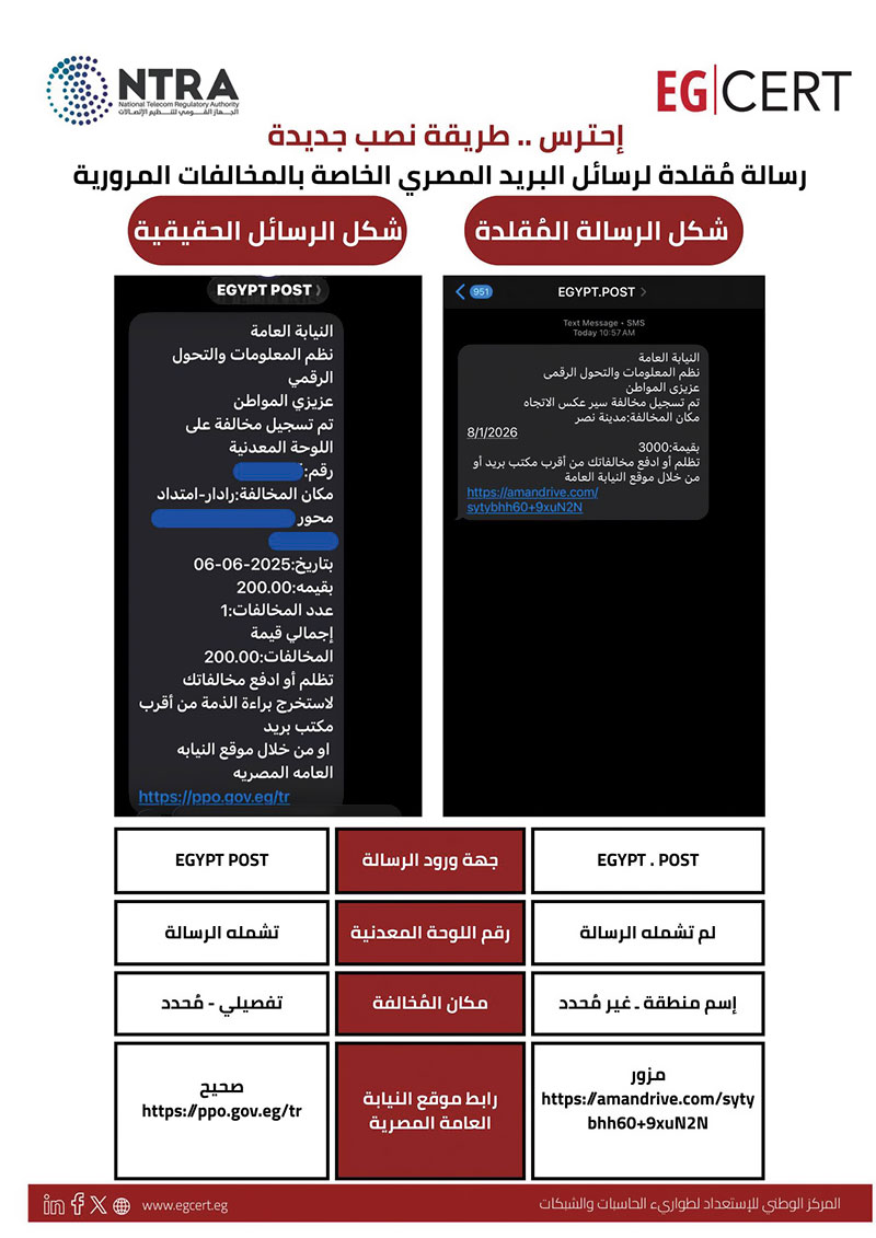 وفى ظل تصاعد البلاغات، تحركت الجهات الرسمية سريعاً لاحتواء الموقف، فقد أصدر المركز الوطنى للاستعداد لطوارئ الحاسبات والشبكات «EG-CERT»، التابع للجهاز القومى لتنظيم الاتصالات، تحذيراً عاجلاً للمواطنين، أكد فيه رصد حملات نصب إلكترونية منظمة تعتمد على إرسال رسائل نصية قصيرة مقلدة تنتحل صفة البريد المصرى، وتهدف إلى الإيقاع بالمواطنين وسرقة بياناتهم المالية والشخصية.