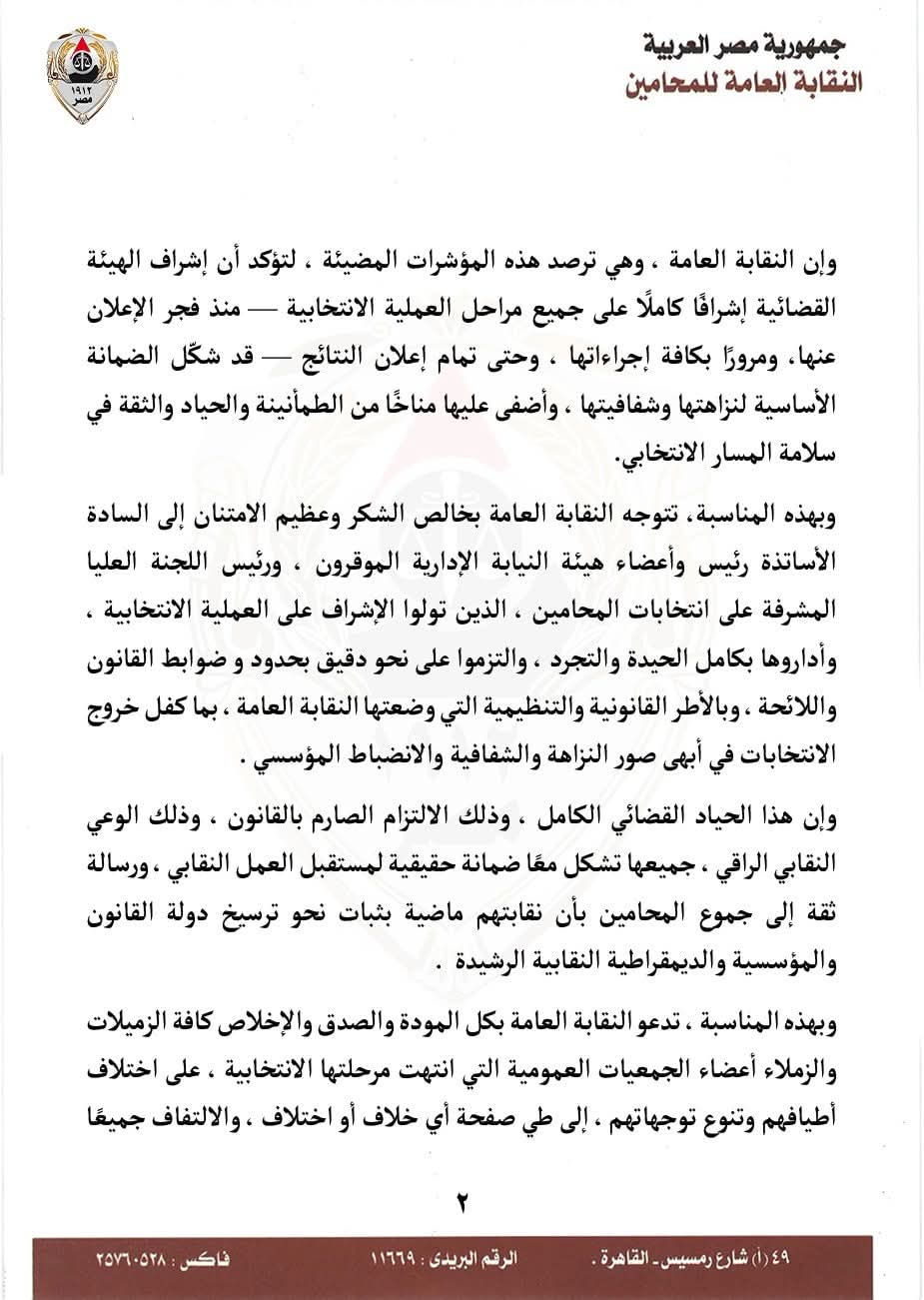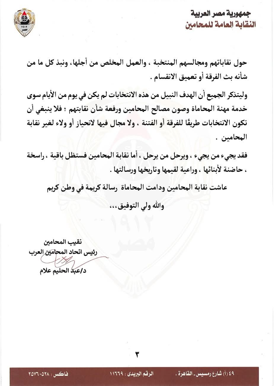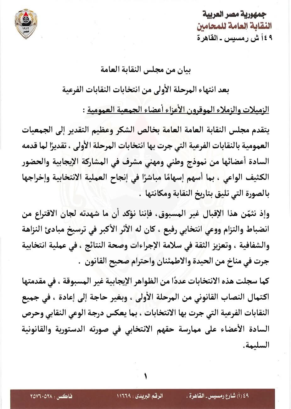 أصدر مجلس نقابة المحامين، برئاسة الدكتور عبد الحليم علام، نقيب المحامين، رئيس اتحاد المحامين العرب، بيانًا بشأن انتهاء المرحلة الأولى من انتخابات النقابات الفرعية.