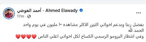 وعبّر العوضي عن سعادته الكبيرة بهذا التفاعل، حيث كتب: "بفضل ربنا وبدعم إخواتي، التيزر الأكثر مشاهدة بـ10 ملايين في يوم واحد»، مضيفًا: «الحمد لله، وفي انتظار البرومو الرسمي… الكساح لكل إخواتي أغلى الناس".