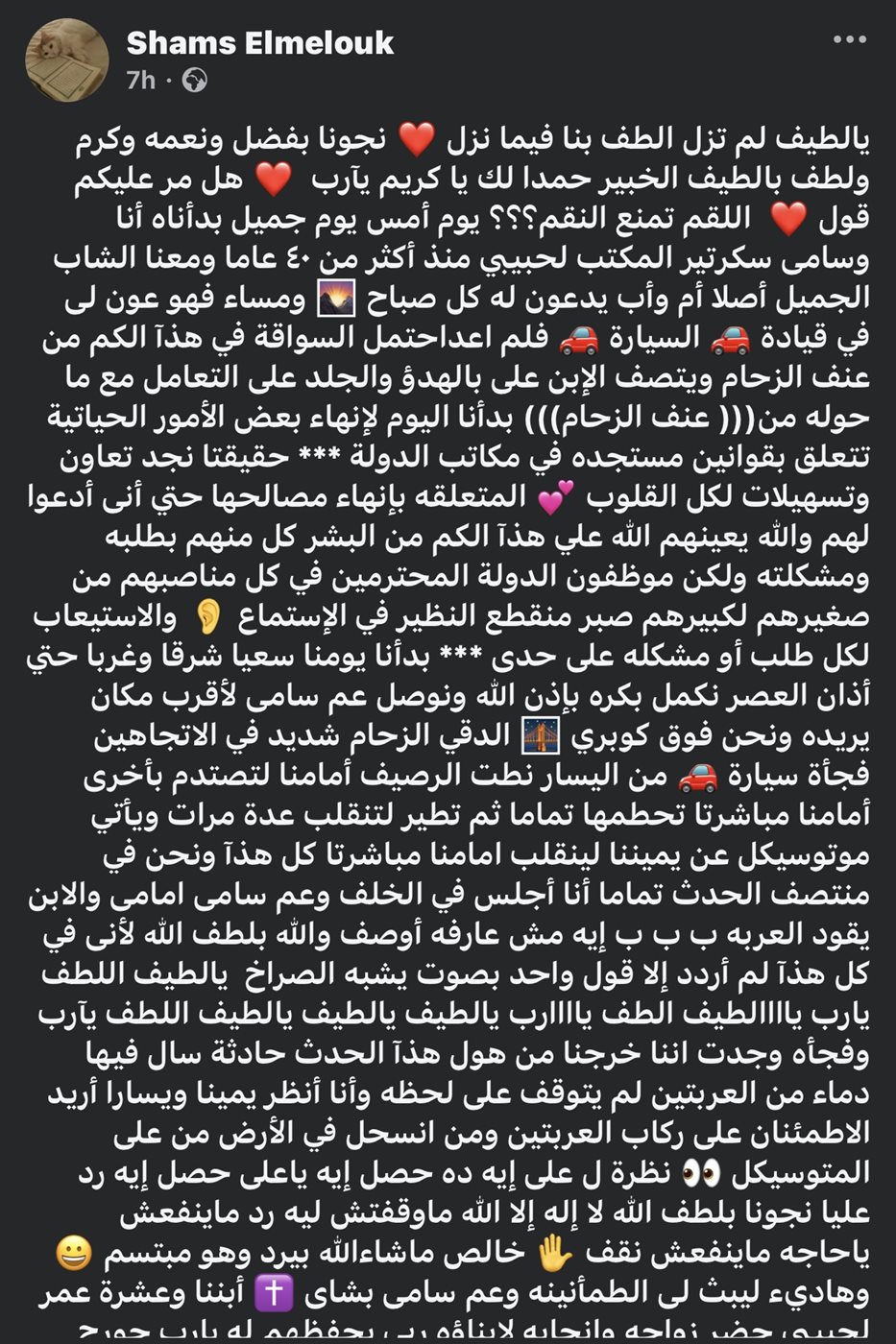 واستكملت: “ولكن موظفون الدولة المحترمين في كل مناصبهم من صغيرهم لكبيرهم صبر منقطع النظير في الإستماع والاستيعاب لكل طلب أو مشكله على حدى بدأنا يومنا سعيا شرقا وغربا حتي أذان العصر نكمل بكره بإذن الله ونوصل عم سامى لأقرب مكان يريده ونحن فوق كوبري الدقي الزحام شديد في الاتجاهين فجأة سيارة من اليسار نطت الرصيف أمامنا لتصتدم بأخرى أمامنا مباشرتا تحطمها تماما ثم تطير لتنقلب عدة مرات ويأتي موتوسيكل عن يميننا لينقلب امامنا مباشرتا كل هذآ ونحن في منتصف الحدث تماما أنا أجلس في الخلف وعم سامى امامى والابن يقود العربه ب ب ب إيه مش عارفه أوصف والله بلطف الله لأنى في كل هذآ لم أردد إلا قول واحد بصوت يشبه الصراخ يالطيف اللطف يارب ياااالطيف الطف ياااارب يالطيف يالطيف يالطيف اللطف يآرب”.