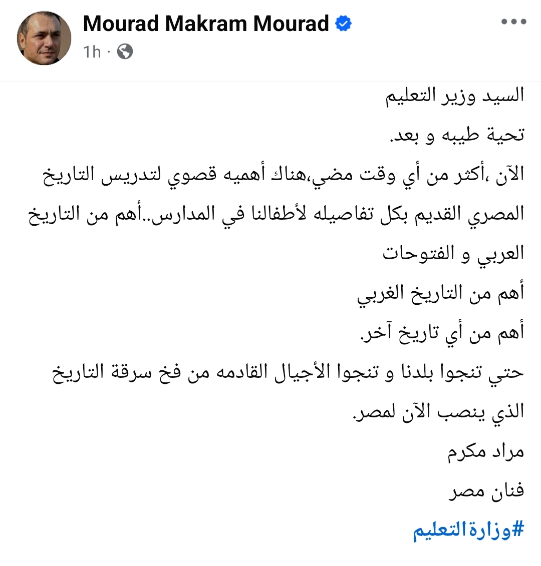 وجه الفنان مراد مكرم رسالة إلى وزير التربية والتعليم، شدد فيها على ضرورة تدريس التاريخ المصري القديم بتفاصيله كافة في المدارس، وذلك عبر صفحته الشخصية على موقع التواصل الاجتماعي فيسبوك.