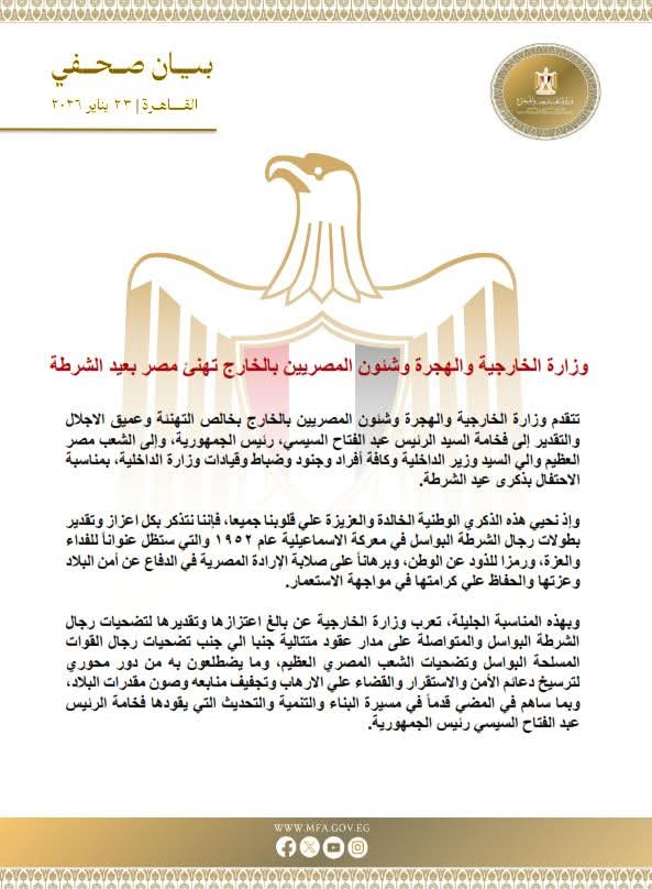 تقدم وزارة الخارجية والهجرة وشئون المصريين بالخارج بخالص التهنئة وعميق الإجلال والتقدير إلى الرئيس عبد الفتاح السيسي، رئيس الجمهورية، وإلى الشعب المصري العظيم، وإلى وزير الداخلية وكافة أفراد وجنود وضباط وقيادات وزارة الداخلية، بمناسبة الاحتفال بذكرى عيد الشرطة.