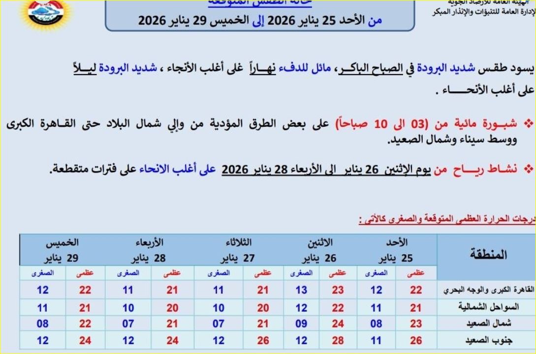 أعلنت الهيئة العامة للأرصاد الجوية أن البلاد تشهد حالة من عدم الاستقرار النسبي في الأحوال الجوية، اعتبارًا من الأحد 25 يناير وحتى الخميس 29 يناير 2026، حيث يسود طقس شديد البرودة في الصباح الباكر، مائل للدفء نهارًا على أغلب الأنحاء، شديد البرودة ليلًا.