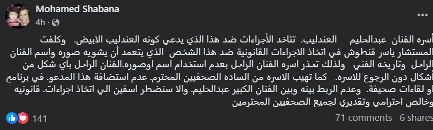 واختتم البيان: "الربط بينه وبين الفنان الكبير عبدالحليم. والا سنضطر اسفين الي اتخاذ اجراءات قانونية … وخالص احترامي وتقديري لجميع الصحفيين المحترمين".