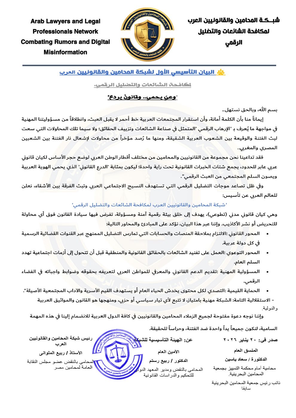 وفي ظل تصاعد موجات التضليل الرقمي التي تستهدف النسيج الاجتماعي العربي وتبث الفرقة بين الأشقاء، نعلن للعالم العربي عن تأسيس: 'شبكة المحامين والقانونيين العرب لمكافحة الشائعات والتضليل الرقمي، وهي كيان قانوني مدني (تطوعي)، يهدف إلى خلق بيئة رقمية آمنة ومسؤولة، تفرض فيها سيادة القانون فوق أي محاولة للتحريض أو نشر الأكاذيب. وإننا عبر هذا البيان، نؤكد على المبادئ والمحاور التالية: