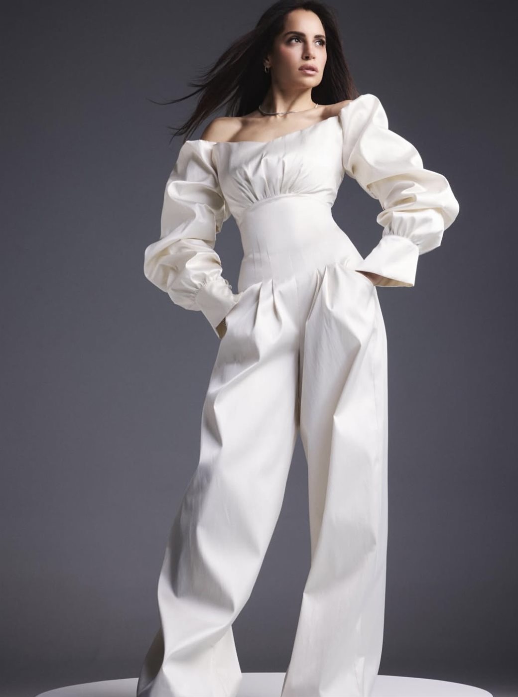 وجاء اللوك بتصميم أنيق، تميز بأكمام منفوخة ولمسة أنثوية ناعمة، مع خصر محدد أبرز رشاقتها، كما اختارت أن يكون البنطال واسعًا.