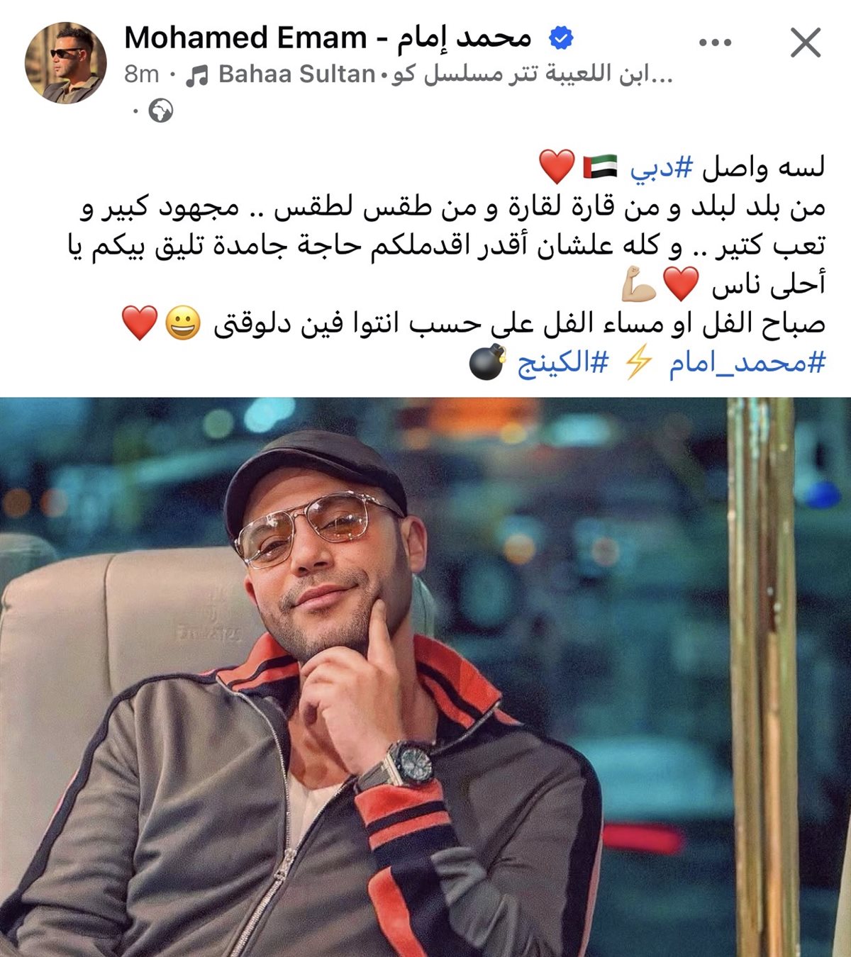 وعبر محمد إمام عن ذلك من خلال منشور عبر حسابه الشخصي على موقع التواصل الاجتماعي فيسبوك، قال فيه: «لسه واصل دبي، من بلد لبلد ومن قارة لقارة ومن طقس لطقس.. مجهود كبير وتعب كتير، وكله علشان أقدر أقدم لكم حاجة جامدة تليق بيكم يا أحلى ناس، صباح الفل أو مساء الفل على حسب إنتوا فين دلوقتي».