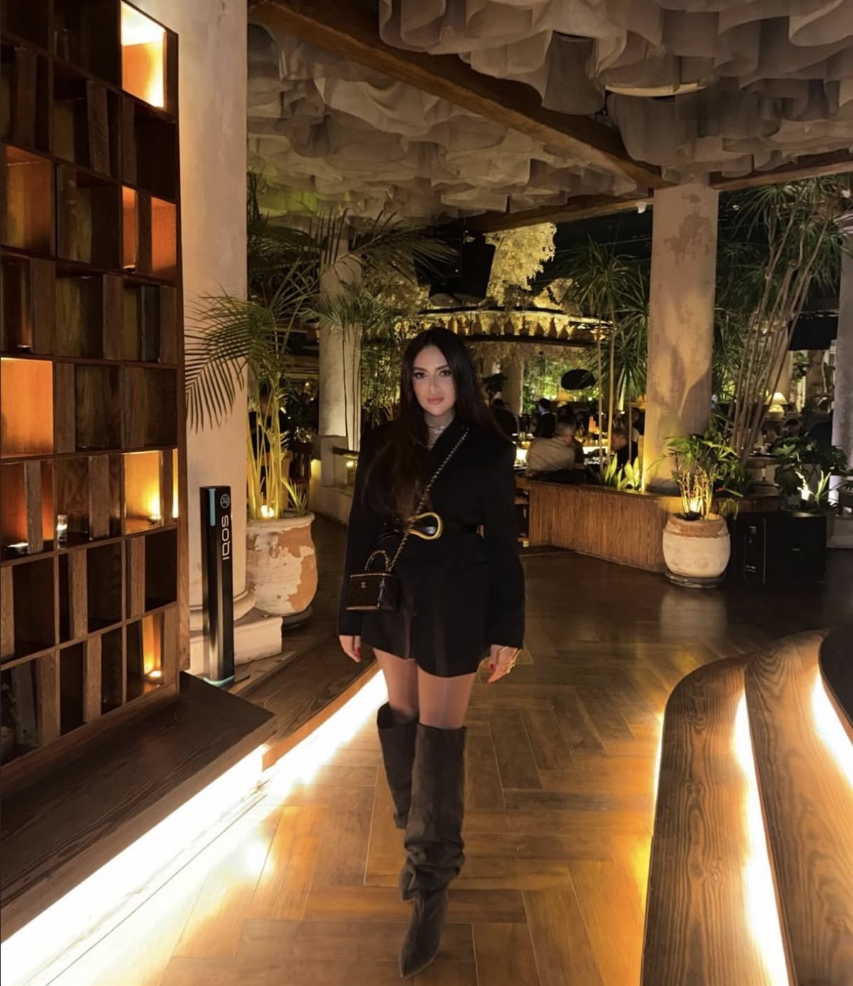 وظهرت زوجة الفنان حمدي الميرغني مرتدية فستانًا أسود قصيرًا اتسم بالبساطة والأناقة، ونسقته مع حذاء طويل باللون الأسود وحقيبة صغيرة، ما أضفى على إطلالتها لمسة عصرية وراقية في الوقت نفسه، بينما اعتمدت مكياجًا ناعمًا أبرز ملامحها بشكل جذاب.