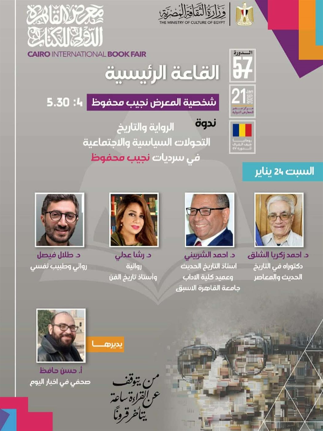 يستضيف معرض القاهرة الدولي للكتاب في دورته الـ57، اليوم السبت 24 يناير 2026، ندوة بعنوان “التحولات السياسية والاجتماعية في سرديات نجيب محفوظ”، وذلك في تمام الساعة الرابعة عصرًا، بالقاعة الرئيسية.