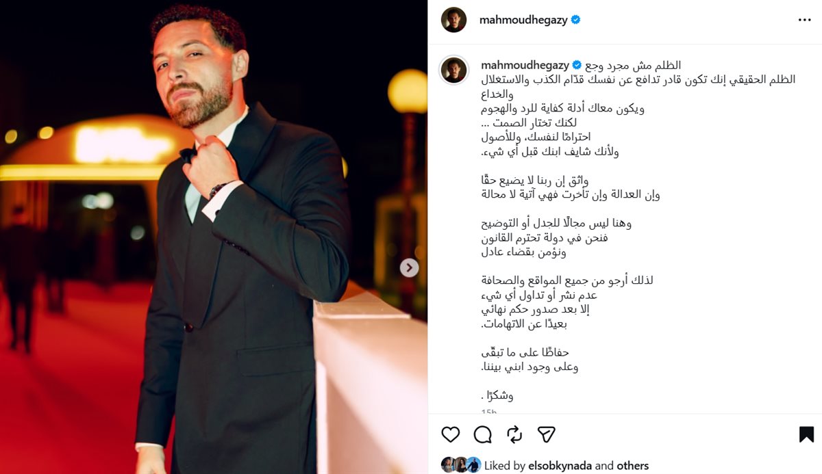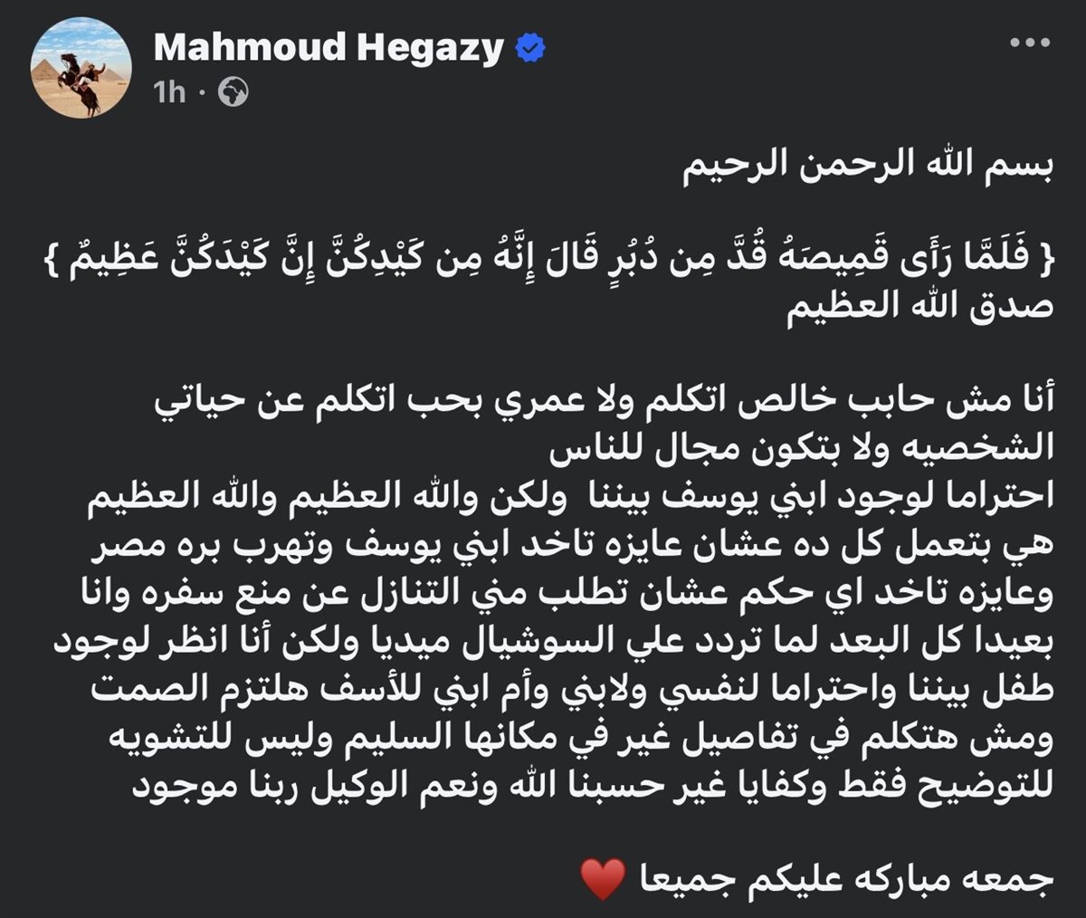 واختتم حجازي منشوره قائلًا: "لذلك أرجو من جميع المواقع والصحافة عدم نشر أو تداول أي شيء إلا بعد صدور حكم نهائي بعيدًا عن الاتهامات، حفاظًا على ما تبقّى وعلى وجود ابني بيننا، وشكرًا".