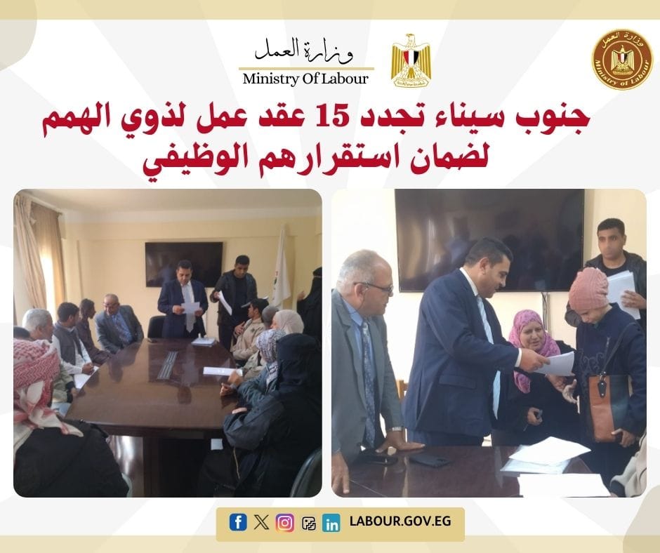 تابع أكرم محمد سيد أحمد، مدير مديرية العمل بجنوب سيناء، إجراءات تجديد 15 عقد عمل لذوي الهمم من أبناء المحافظة.