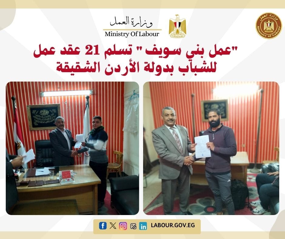 كما أعلن المهندس أحمد العربي، وكيل وزارة العمل ببني سويف، عن تسليم دفعات من عقود العمل لشباب المحافظة للعمل بدولة الأردن (14 عقداً بتاريخ 15 يناير و7 عقود بتاريخ 18 يناير).