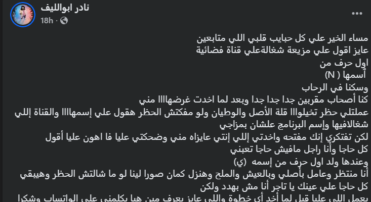 كتب أبو الليف: “مساء الخير علي كل حبايب قلبي اللي متابعين عايز اقول علي مذيعة شغالةعلي قناة فضائية اول حرف من ٱسمها ( N) وسكنا في الرحاب كنا أصحاب مقربين جدا جدا جدا وبعد لما اخدت غرضهاااا مني عملتلي حظر تخيلوا قلة الأصل والوطيان ولو مفكتش الحظر هقول علي إسمهاااا والقناة إللي شغالافيها وإسم البرنامج علشان بمزاجي”.