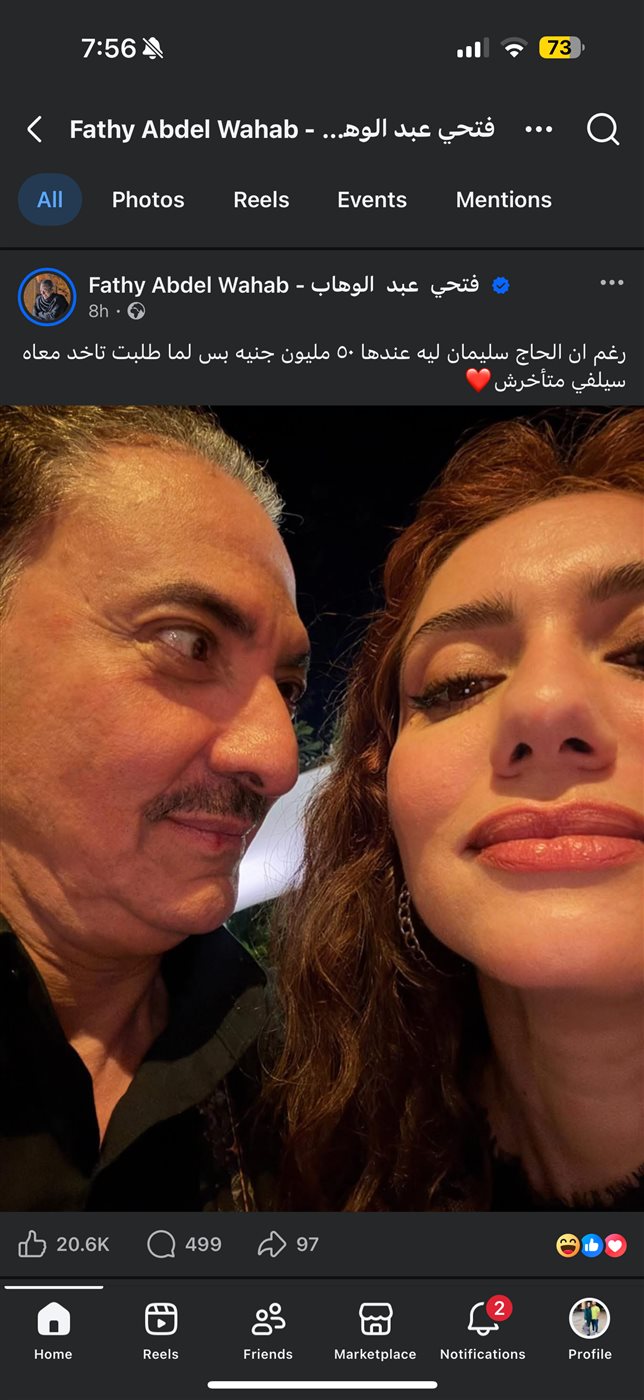 وظهر فتحي عبد الوهاب في الصورة وهو يلتقط "سيلفي" مع جيهان الشماشرجي، معلقًا: "رغم إن الحاج سليمان ليه عندها 50 مليون جنيه، بس لما طلبت تاخد معاه سيلفي متأخرش".