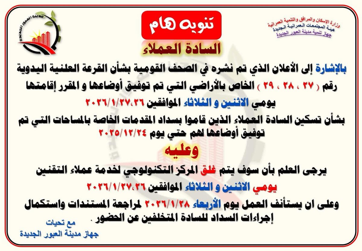 وأوضح الجهاز عبر حسابه الرسمي بموقع التواصل الاجتماعي فيسبوك، أنه وفقاً للإعلان الذي تم نشره في الصحف القومية بشأن القرعة العلنية اليدوية رقم ( ۲۷ ، ۲۸ ، ۲۹ ) الخاص بالأراضي التي تم توفيق أوضاعها و المقرر إقامتها يومي الاثنين والثلاثاء الموافقين 26-27 يناير 2026، بشأن تسكين المواطنين العملاء الذين قاموا بسداد المقدمات الخاصة بالمساحات التي تم توفيق أوضاعها لهم حتي يوم 24 ديسمبر 2025، لذا سيتم غلق المركز.