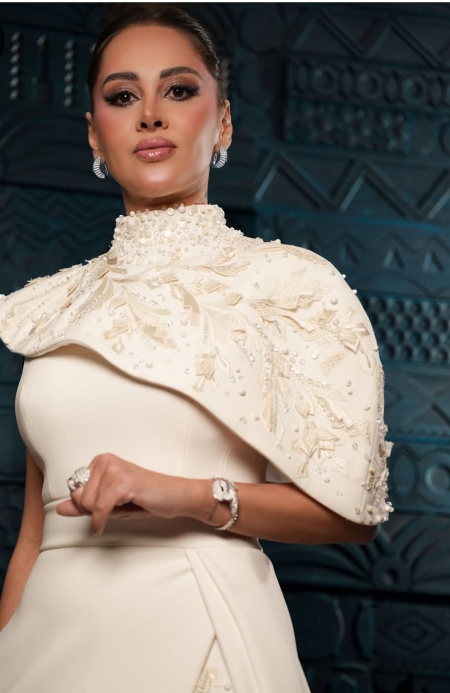 وبدت ياسمين رئيس بإطلالة ساحرة تمزج بين الاحتشام والجاذبية في آن واحد، حيث ارتدت فستانًا طويلًا مجسمًا بقصة رقبة طويلة، صُمم من قماش الكريب باللون الكريمي، وطرز من الأمام بحبيبات اللؤلؤ.