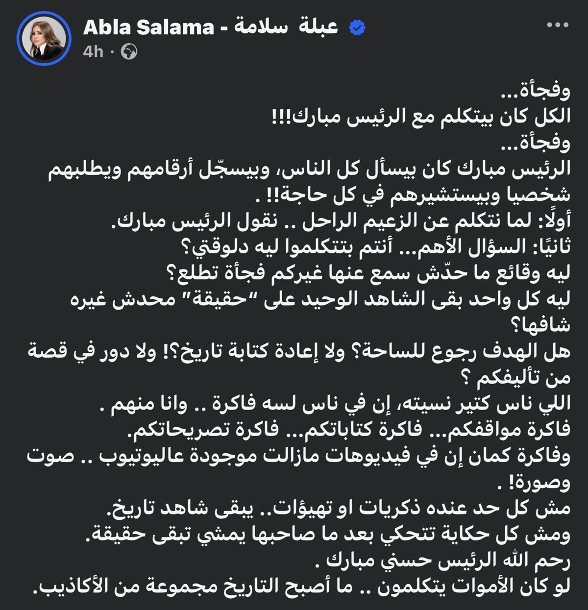 واختتمت عبلة منشورها قائلة: “رحم الله الرئيس حسني مبارك . لو كان الأموات يتكلمون .. ما أصبح التاريخ مجموعة من الأكاذيب”.