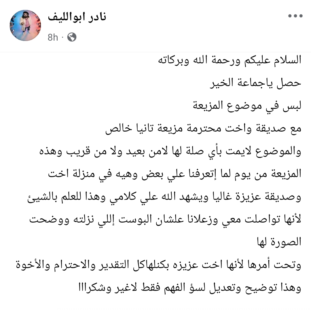وأكد أبو الليف أن ما نُشر سابقًا لا يمت بأي صلة بصديقته وأخته المحترمة، مشددًا على أن العلاقة بينهما منذ التعارف كانت علاقة أخوة وصداقة قوية.
