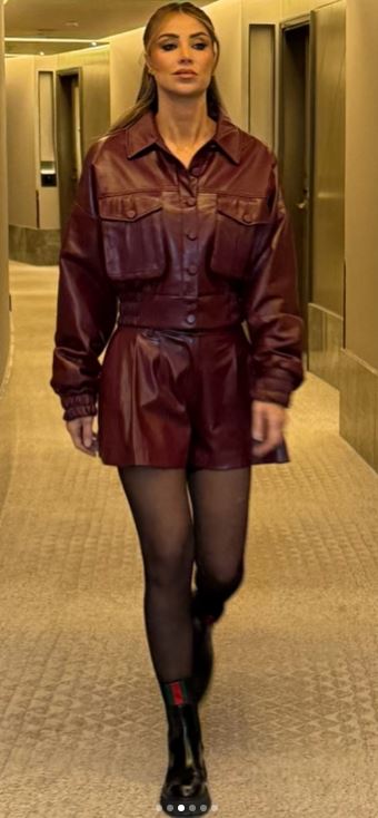 وبدت أنابيلا هلال بإطلالة عصرية، إذ ارتدت بدلة مصممة من الجلد باللون البرغندي، تنتمي إلى صيحة الـ«هاي شورت»، وانتعلت بوتًا طويلًا مصنوعًا من الجلد باللون الأسود.