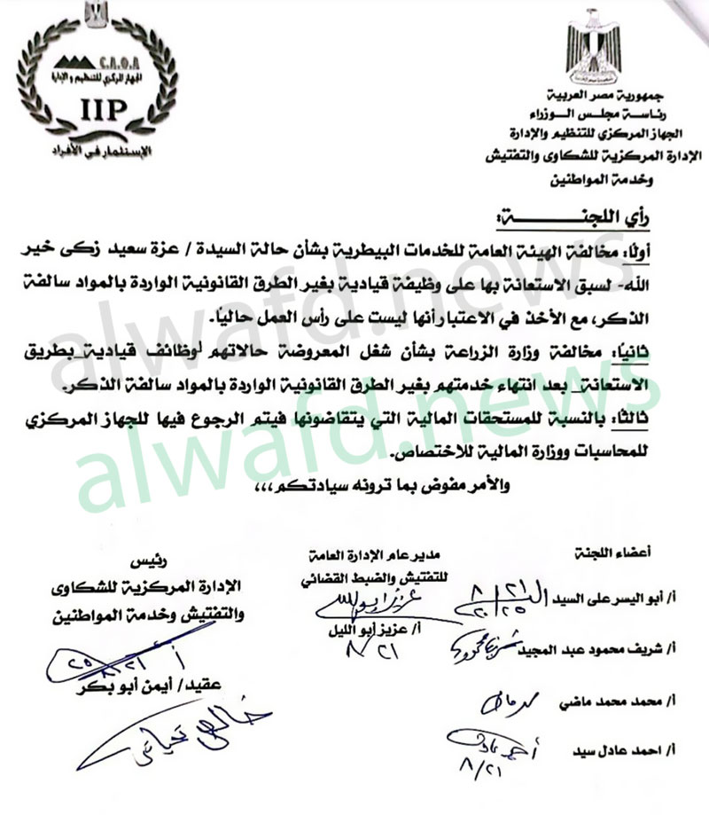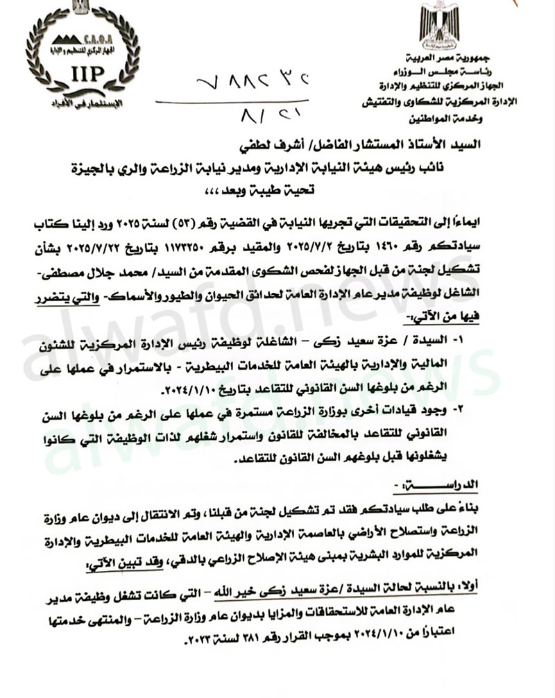 وأوضح التقرير، الذي حصلت الوفد على نسخة منه، الذي جاء ردًا على شكوى بشأن شغل عدد من الوظائف القيادية بالإدارة العامة لحدائق الحيوان والطيور والأسماك، أن الجهاز شكّل لجنة متخصصة لفحص الوقائع، وانتقل إلى ديوان عام وزارة الزراعة والجهات التابعة لها، وانتهى إلى رصد عدة مخالفات، أبرزها استمرار شاغلي وظائف قيادية في العمل بعد انتهاء خدمتهم القانونية.