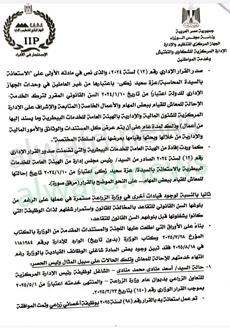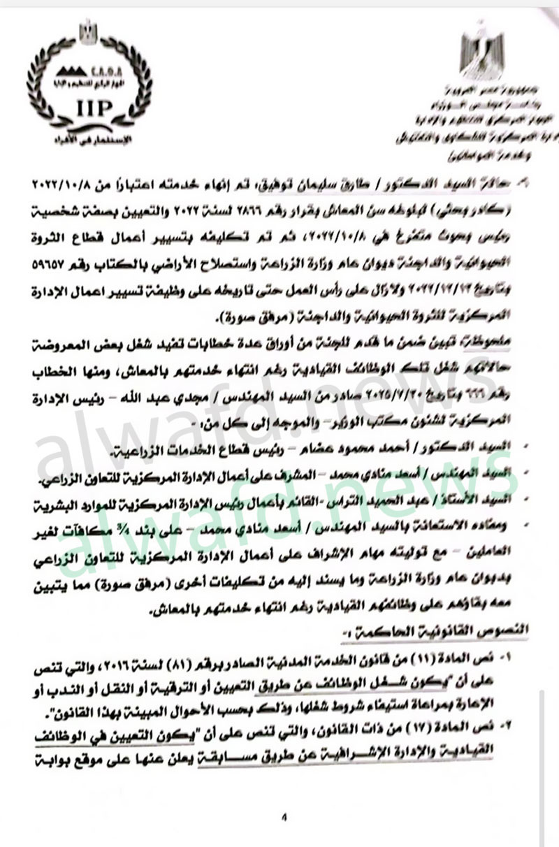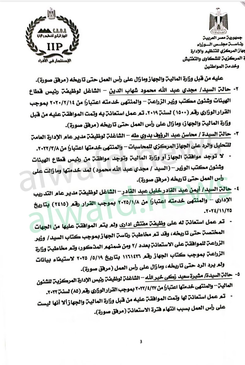 أ .م: رئيس الإدارة المركزية للتعاون الزراعي، انتهت خدمته في مايو 2025، ثم أُعيدت الاستعانة به بوظيفة أخصائي زراعي، مع استمراره فعليًا في ممارسة مهام الإشراف القيادي.